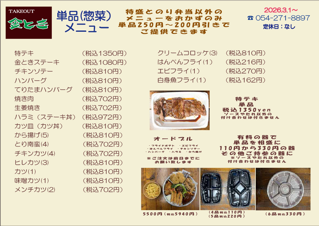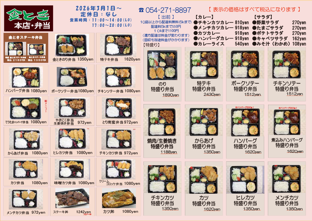 金とき若松町本店お弁当メニュー