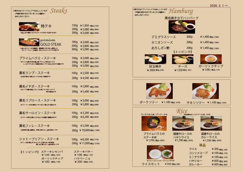 Steak Gold メニュー表